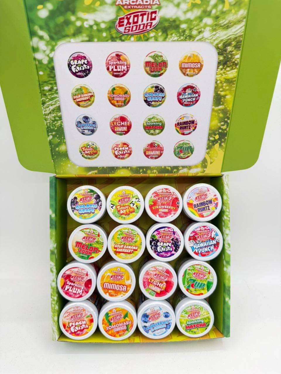 Imagine opening a fresh jar and getting hit with that unmistakable fizz – sweet, effervescent notes of Grape Fanta, Peach Fanta, 7UP, Hawaiian Punch, sparkling plum, melon zoda, and exotic twists like Lychee Ramune or Rainbow Runtz. The inhale explodes with candy-bright citrus, tropical fruit, and bubbly sweetness, while the exhale leaves a clean, lingering herbal depth that screams top-shelf quality. Whether you’re a daily dabber chasing flavor perfection or a wholesale buyer stocking shelves that fly off, buying Arcadia Exotic Soda Badder means investing in the best.